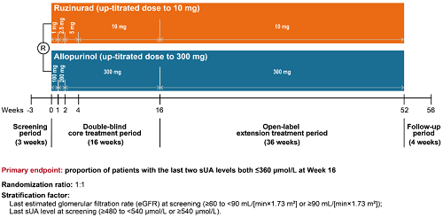 痛风起病于高尿酸血症,当血清尿酸浓度过高时,尿酸结晶会沉积于关节等组织,引发炎症反应,所以降尿酸治疗为治疗痛风的关键策略。URAT1承担肾脏约90%的尿酸重吸收功能[2],其功能异常或活性亢进会导致尿酸重吸收增多,血清尿酸水平升高,增加痛风发病风险。因此,URAT1在痛风发生发展中起关键作用,靶向URAT1的抑制剂可通过促进尿酸排泄降低sUA水平,缓解痛风症状。鲁兹诺雷钠片是AG官网医药自主研发的一种高选择性URAT1抑制剂,在前期的一期、二期研究中,鲁兹诺雷钠片耐受性良好,并显示出显著降低高尿酸血症患者sUA的效果[3]。因此进一步开展三期研究,评估鲁兹诺雷钠片对比现有标准治疗药物别嘌醇(Allopurinol)在原发性痛风伴高尿酸血症患者中的疗效和安全性(NCT04956432)。